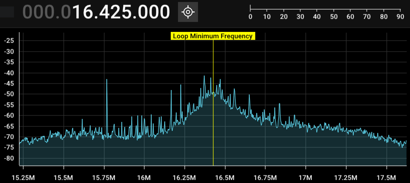 As it turns out, the bandwidth of the antenna is actually far wider and shallower than my calculations would suggest. This was to be expected as the idealized calculations do not take into effect the resistance from the terminal connections to the capacitor. Using an RTL-SDR, you can actually see the frequency to which the antenna is tuned, and even at its lowest possible tuning frequency, the peak is not very sharp.