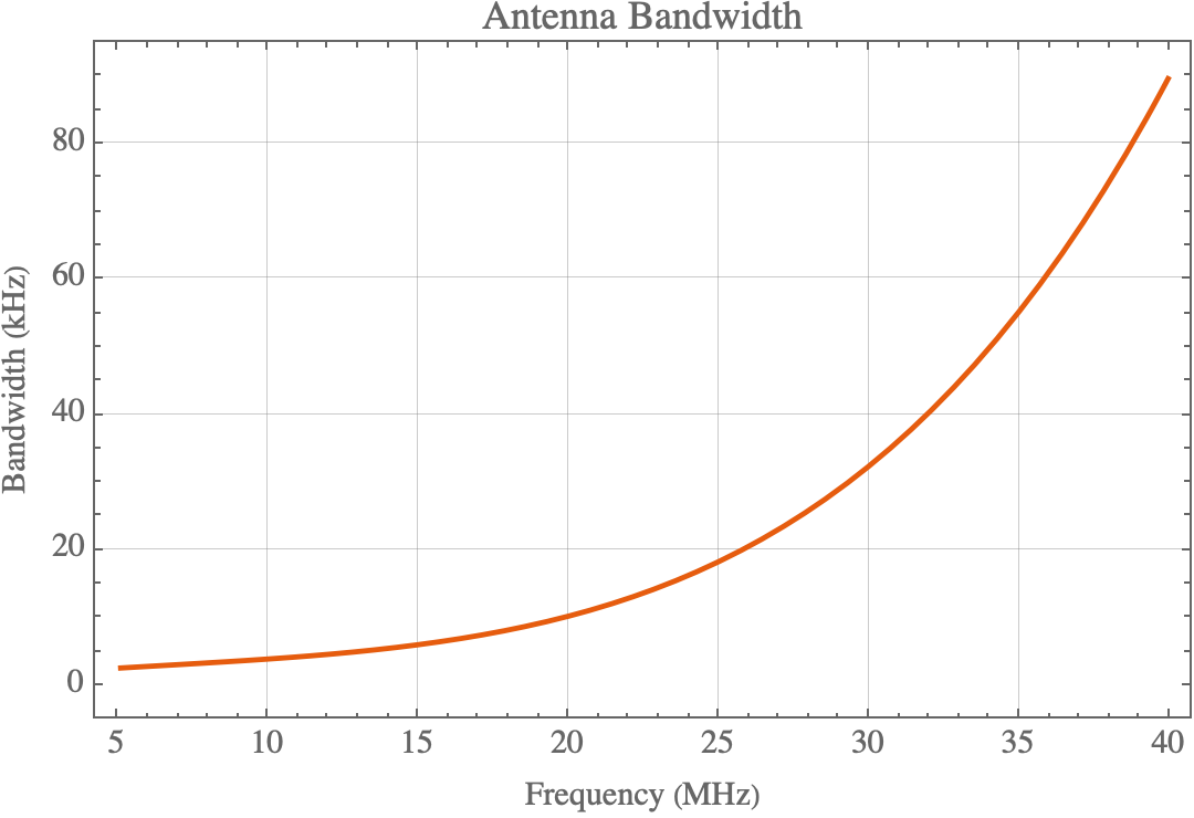 Importantly, Q is a function of three things that are also functions of frequency, so we have to plug them all in to each other, a messy exercise in algebra that I will omit here. Anyway, we can see that the bandwidth of the antenna is perfectly usable at every frequency we would be using this antenna on.