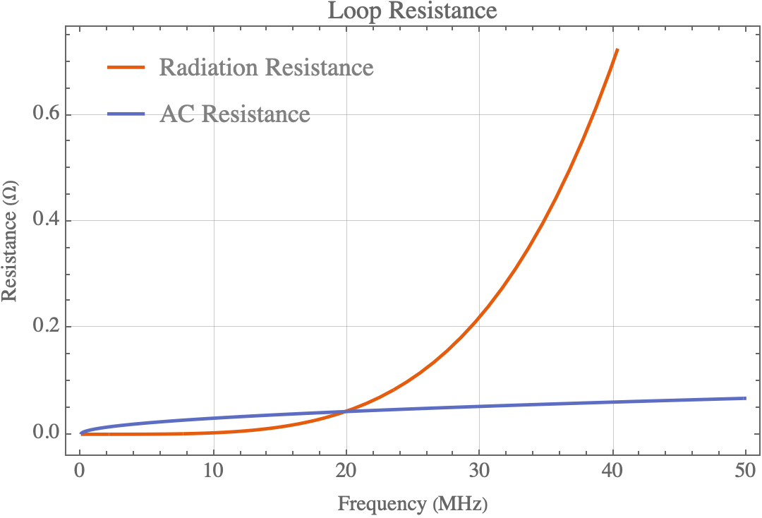 Plotting these two equations as a function of frequency, we can see that although the AC resistance depends on the frequency due to the skin effect, it doesn’t vary anywhere near as much as the radiation resistance does.